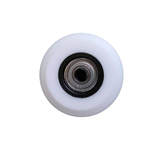 Hjulet er fremstillet i slidstærkt, hvidt plast med integreret kugleleje, hvilket sikrer en lydsvag og præcis glidning. Den horisontale placering (floating) hjælper med at holde slæden stabilt centreret under både hurtige og kontrollerede øvelser.
